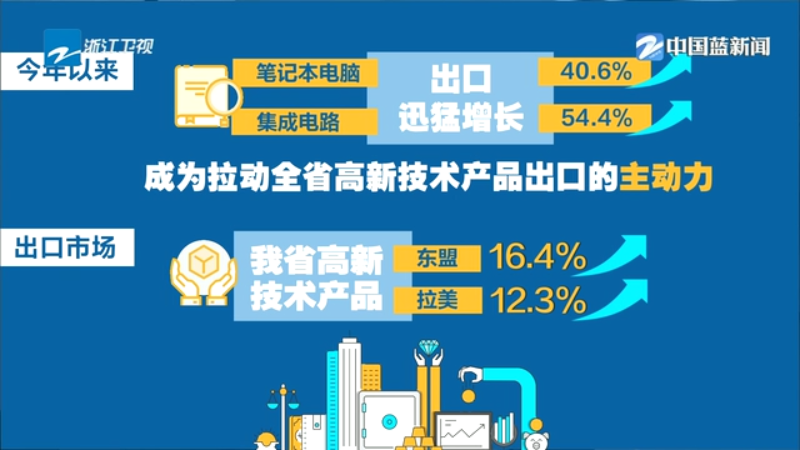今年以来,浙江笔记本电脑、集成电路等产品出口迅猛增长,增速分别达到40.6%和54.4%,成为拉动全省高新技术产品出口的主动力。从出口市场看,浙江高新技术产品对东盟和拉美出口分别增长16.4%、12.3%。